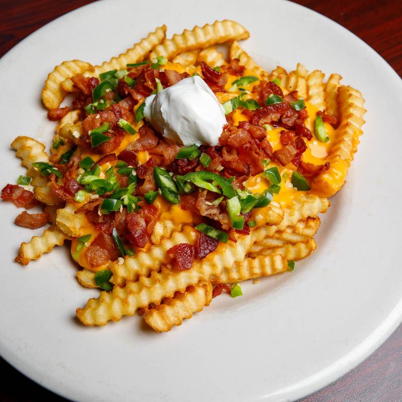 Topped with cheddar cheese, green onion, bacon & sour cream